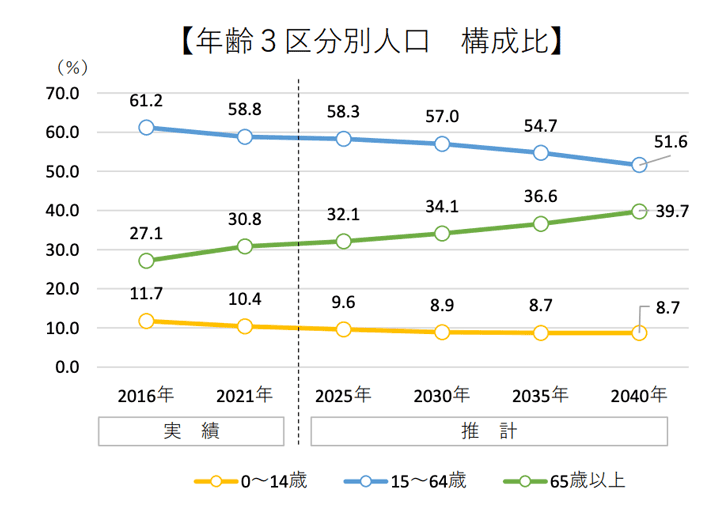 2040年には、65歳の高齢者が約40%と増え、生産人口は減ります。