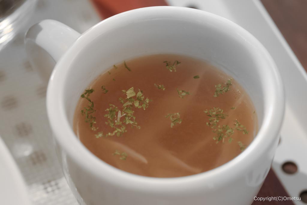 ランチのコンソメスープ。タマネギ入りで、コクと旨味が楽しめます。