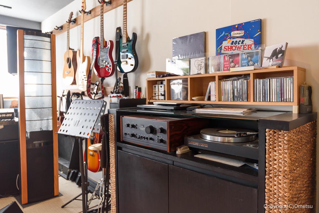 開放的な店内の奥には、楽器やステレオ。