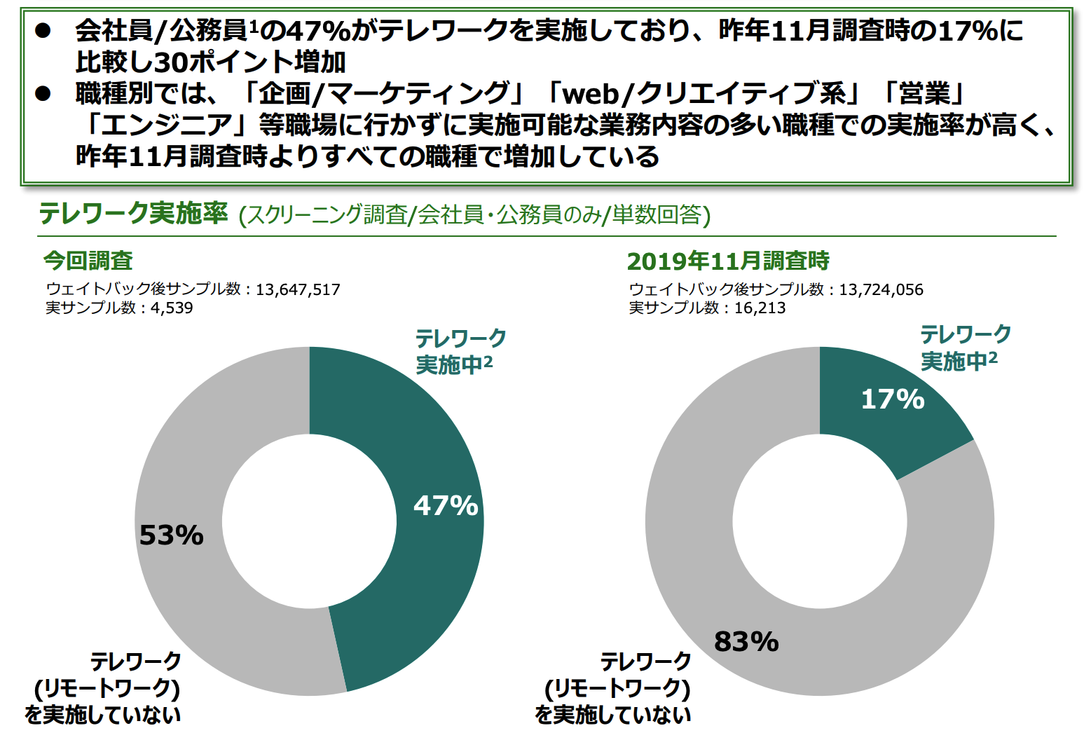 しかし、2020年4月のコロナウイルスでの緊急事態宣言を受け、大企業のみならず、中小・零細企業までもがテレワークを実施しました。