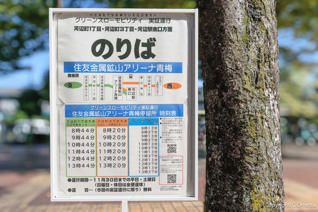 河辺駅南口から、住友金属アリーナ、河辺市民センター方面へ運行します。