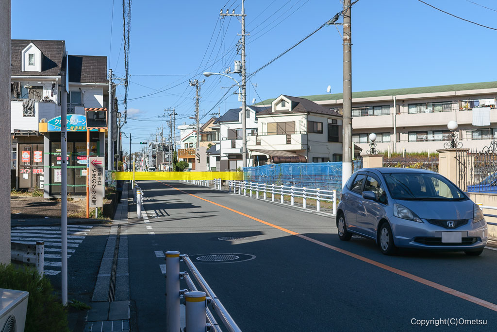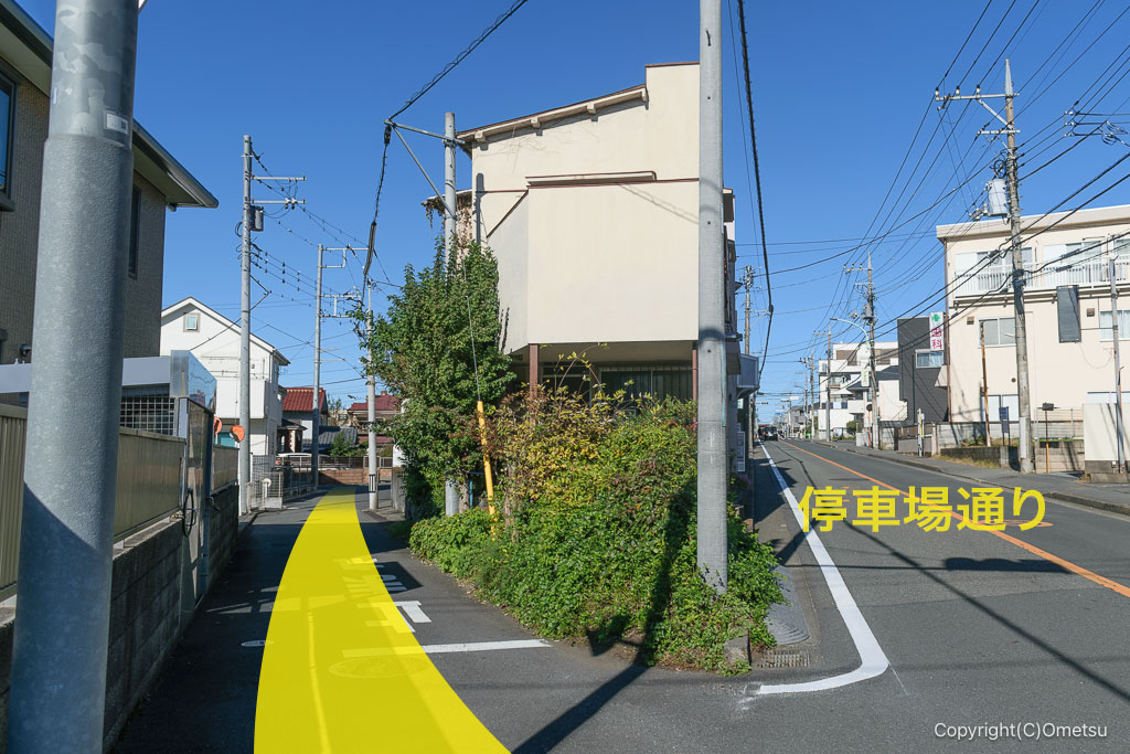 国道16号線「松原町5丁目」交差点から西方向へ進む道を進むと、軌道跡の道路と合流します。