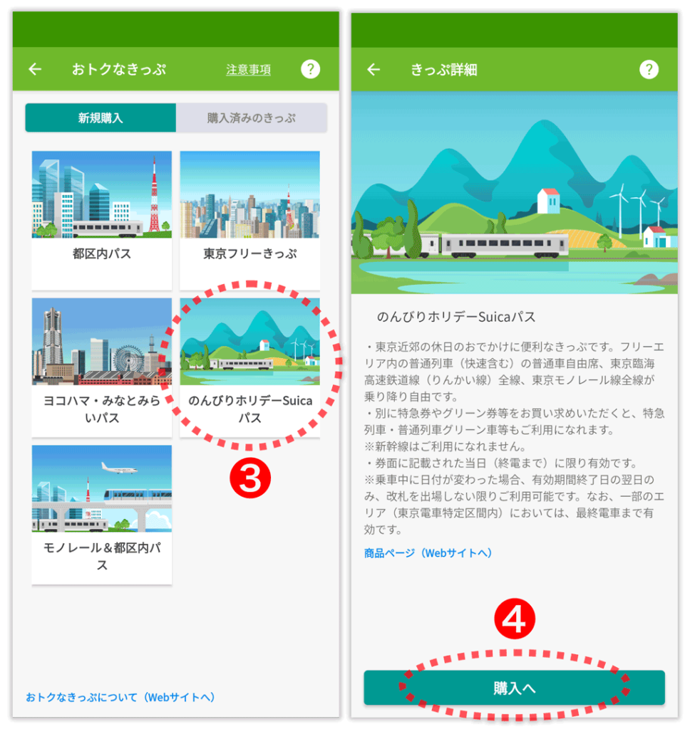 「のんびりホリデーSuicaパス」は、モバイルSuica上で購入できます。