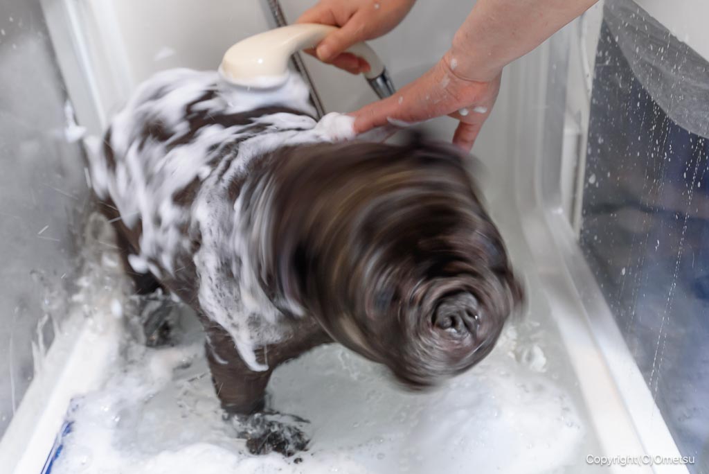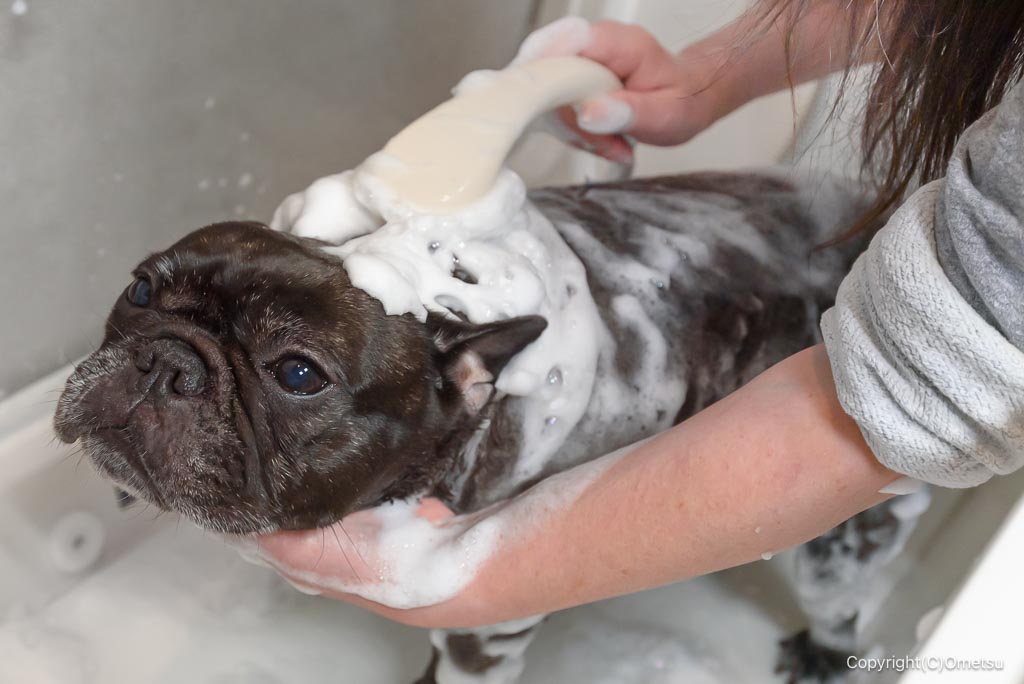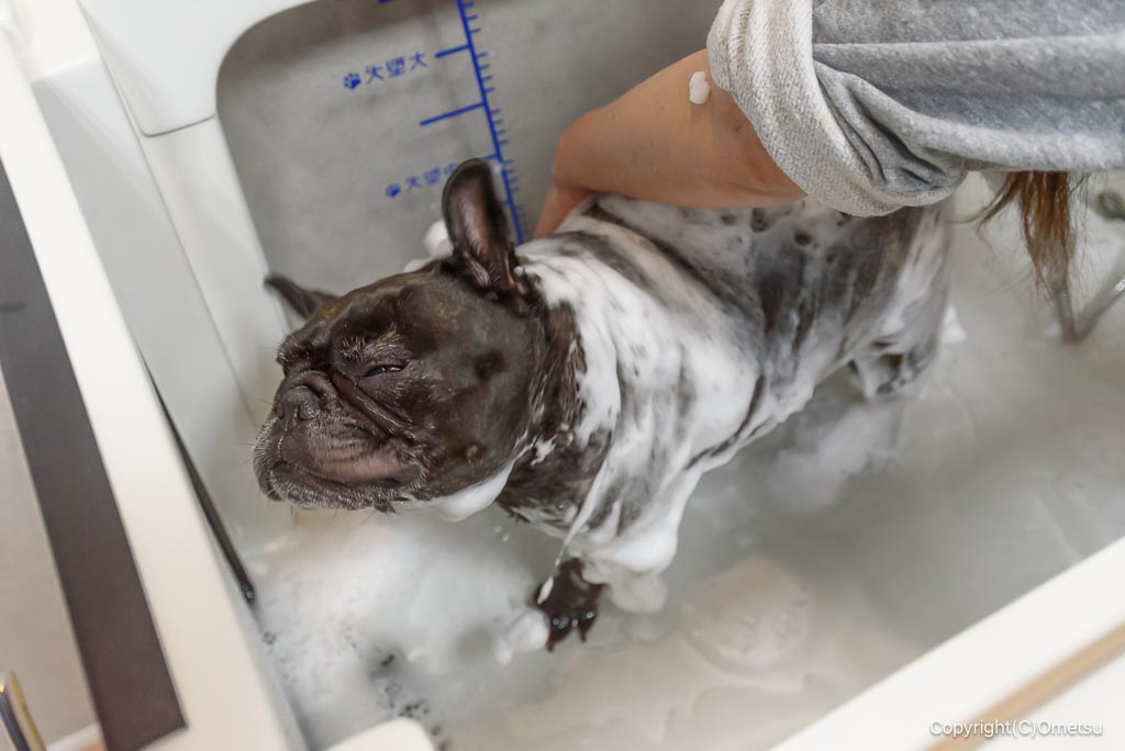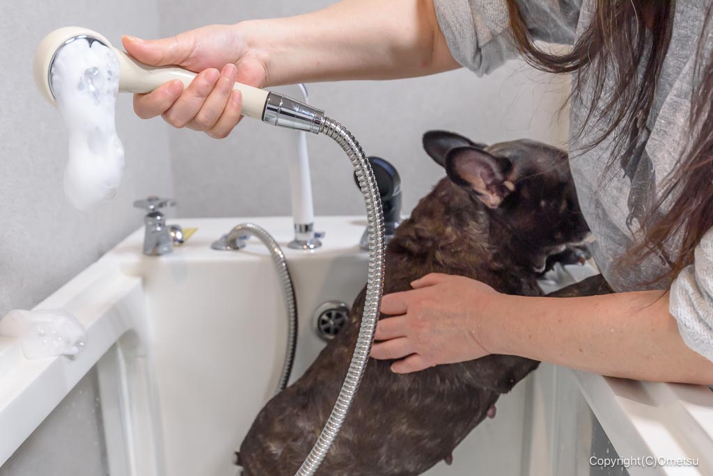 クリーミーな泡でワンコを洗います。結構、飼い主も楽しいかも?