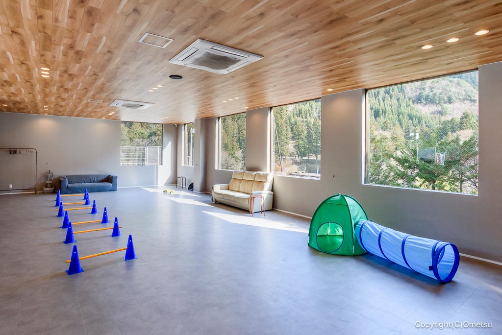 HOMELAND OMEのドッグランは渓谷が見渡せる室内。