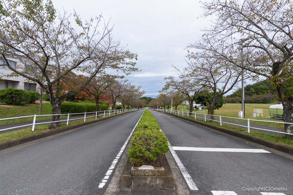 学園内の道。東京郊外の大学でもかなり広いキャンバスでしょうね。
