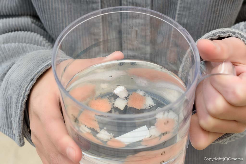 吸水性の良さをアピール。ホットマン「1秒タオル」は、水をよく吸い、他のタオルよりすぐ沈む様子がよく分かります。
