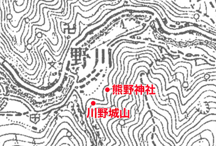 熊野神社と沢を挟み、西側が川野城山跡。画面左側の尾根上にあったと云われます。