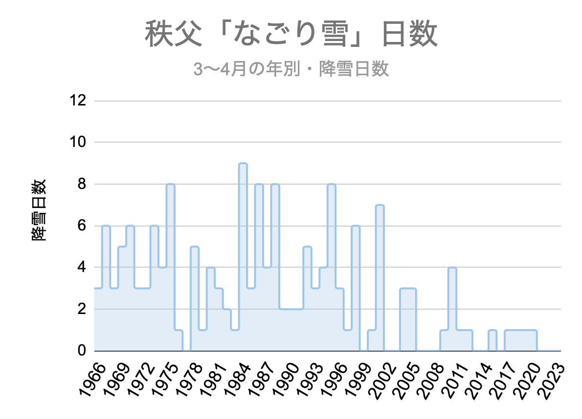 1970年代は、年平均2.6日「なごり雪」が降りました。当時は現実感のある歌詞だったことが、うかがえます。