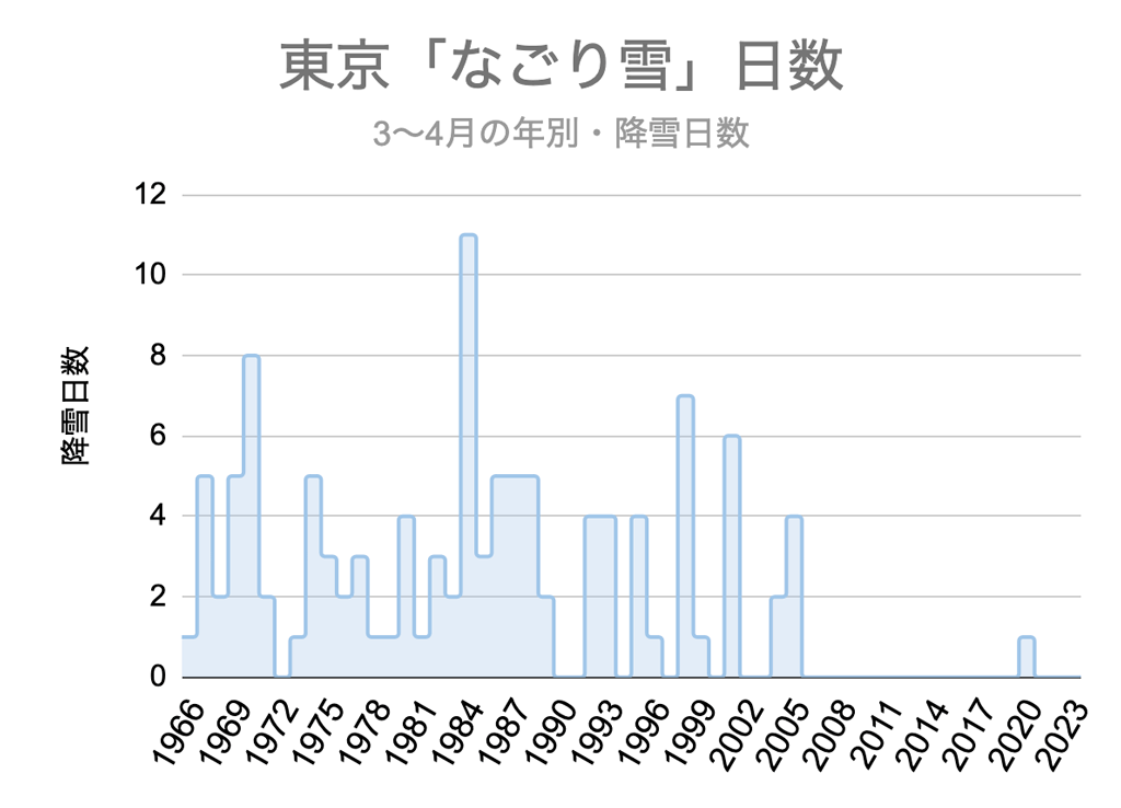 上のグラフは、過去60年間(1964〜2023年)、東京都心で3〜4月に雪の降った日数。