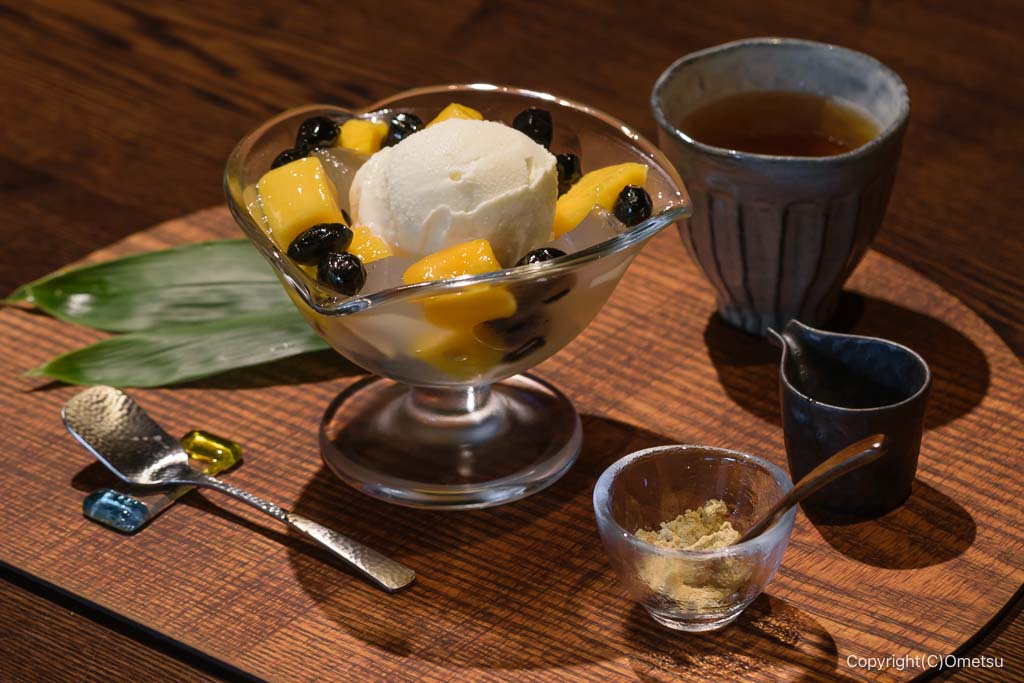 信州産ミルクのアイスを中心に、適度に凍らせたマンゴーと、丹波の黒豆、葛餅。葛餅は銀座かずや特製です!