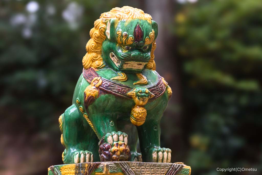 拝殿前の狛犬。陶器製でしょうか、カラフルな色使いです。