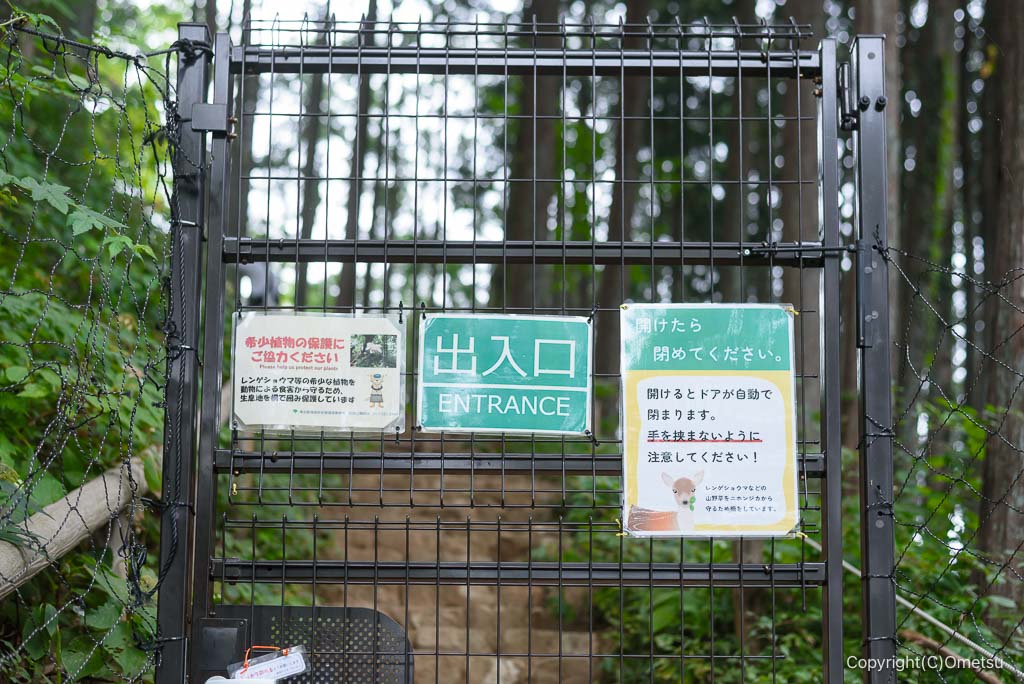 自生地入口には、シカよけのドア。食害からレンゲショウマを守ります。