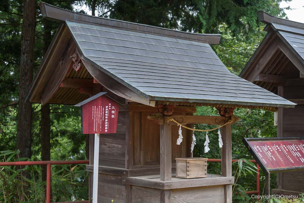 最初に現れるのは、伊邪那岐命(イザナギ)と妻の伊邪那美命(イザナミ)を祀る二柱社。天地創造(国産み・神産み)の神様です。