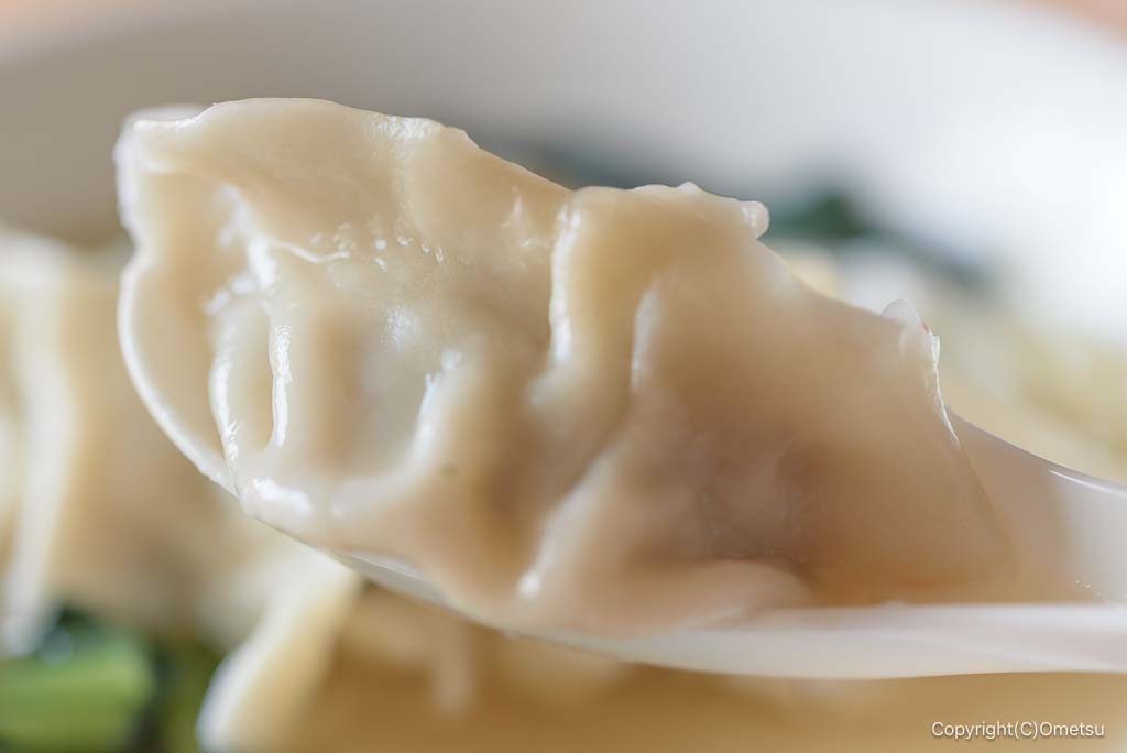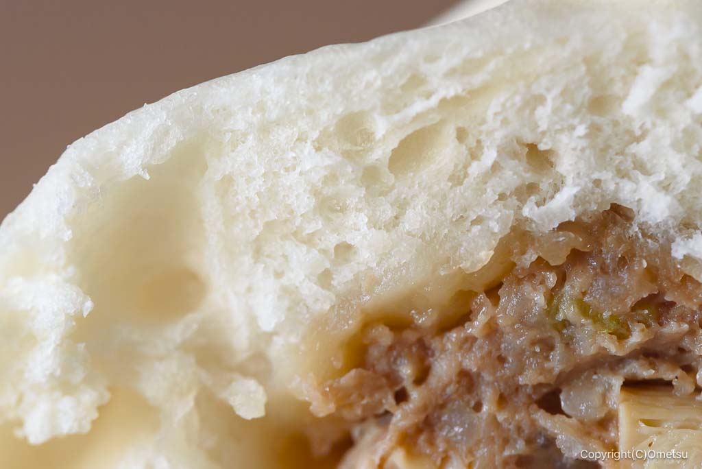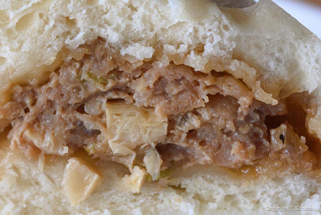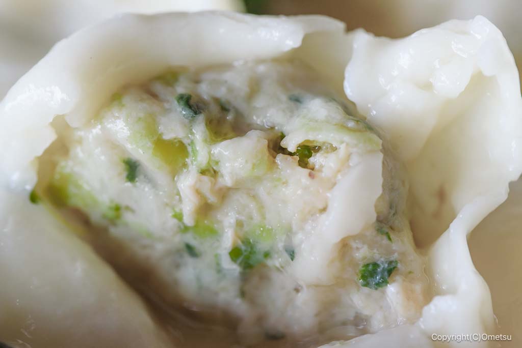豚肉を始め、タケノコ・ネギなどの入った餡。やや濃い目な、力強い味わいです。