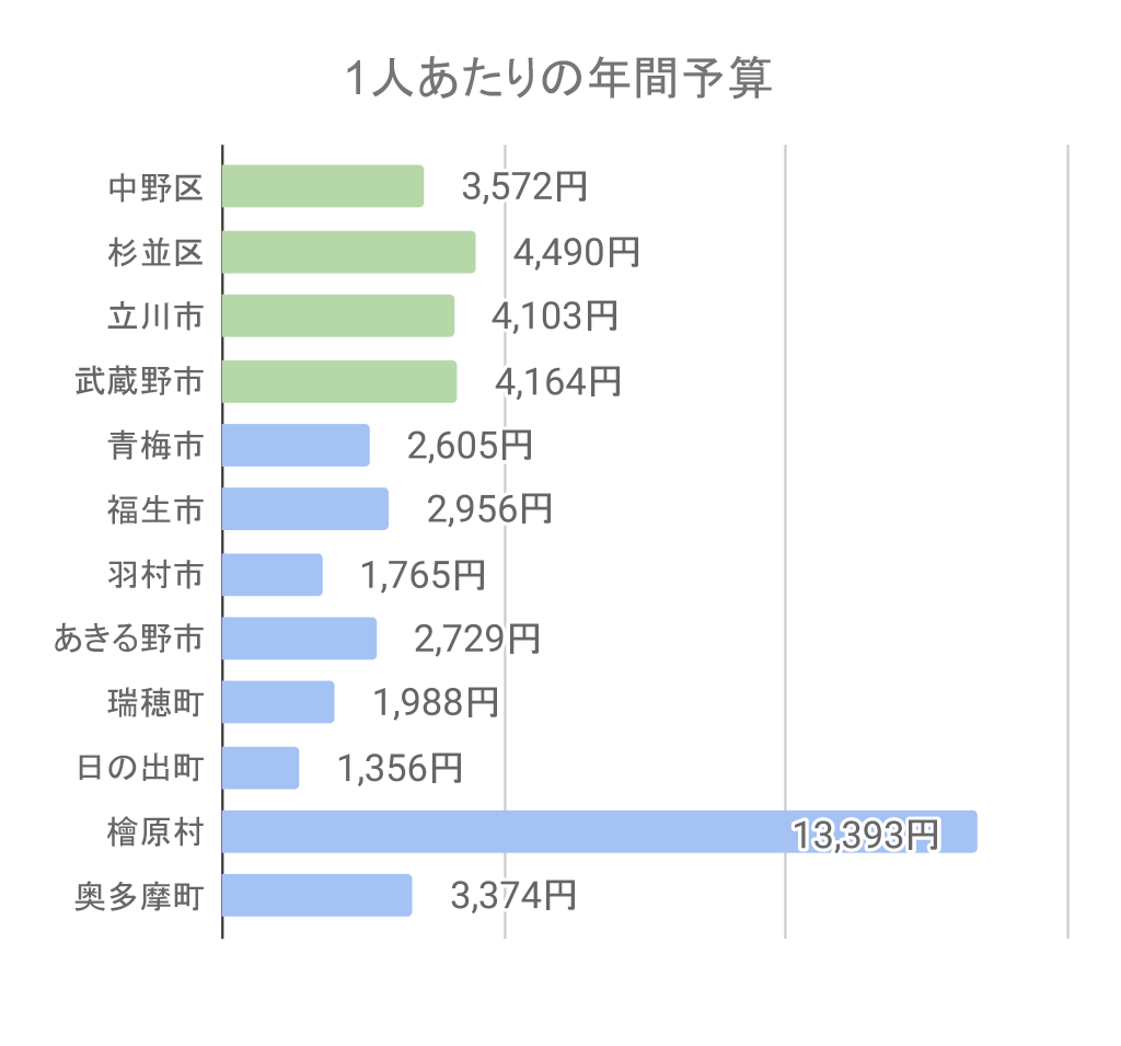 人口の少ない檜原が突出していますが、それ以外は、区部や武蔵野・立川が潤沢な予算です。
