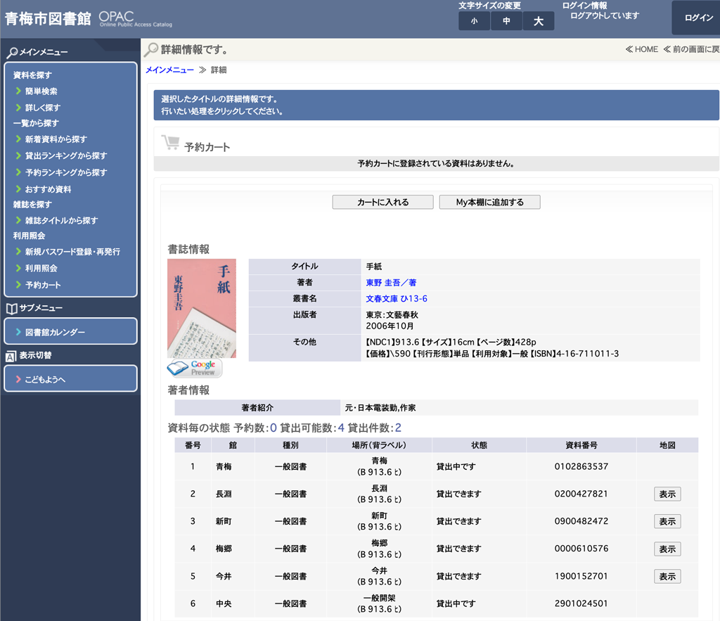 大抵の自治体では、図書館のトップページから検索可能。上記の画面は青梅市ですが、貸出できるかもひと目で分かります。
