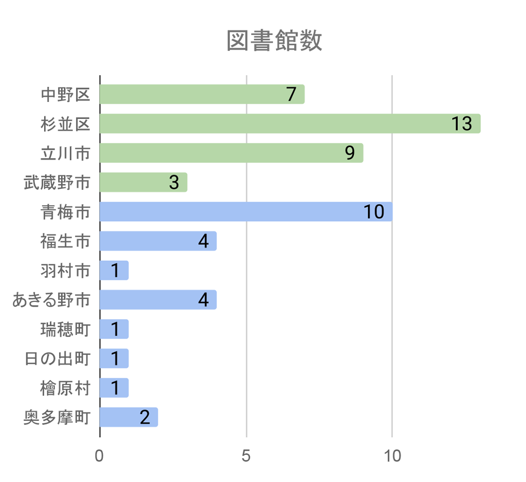 都市部では、あきる野、福生が多め。図書館が少ない羽村も多いです。