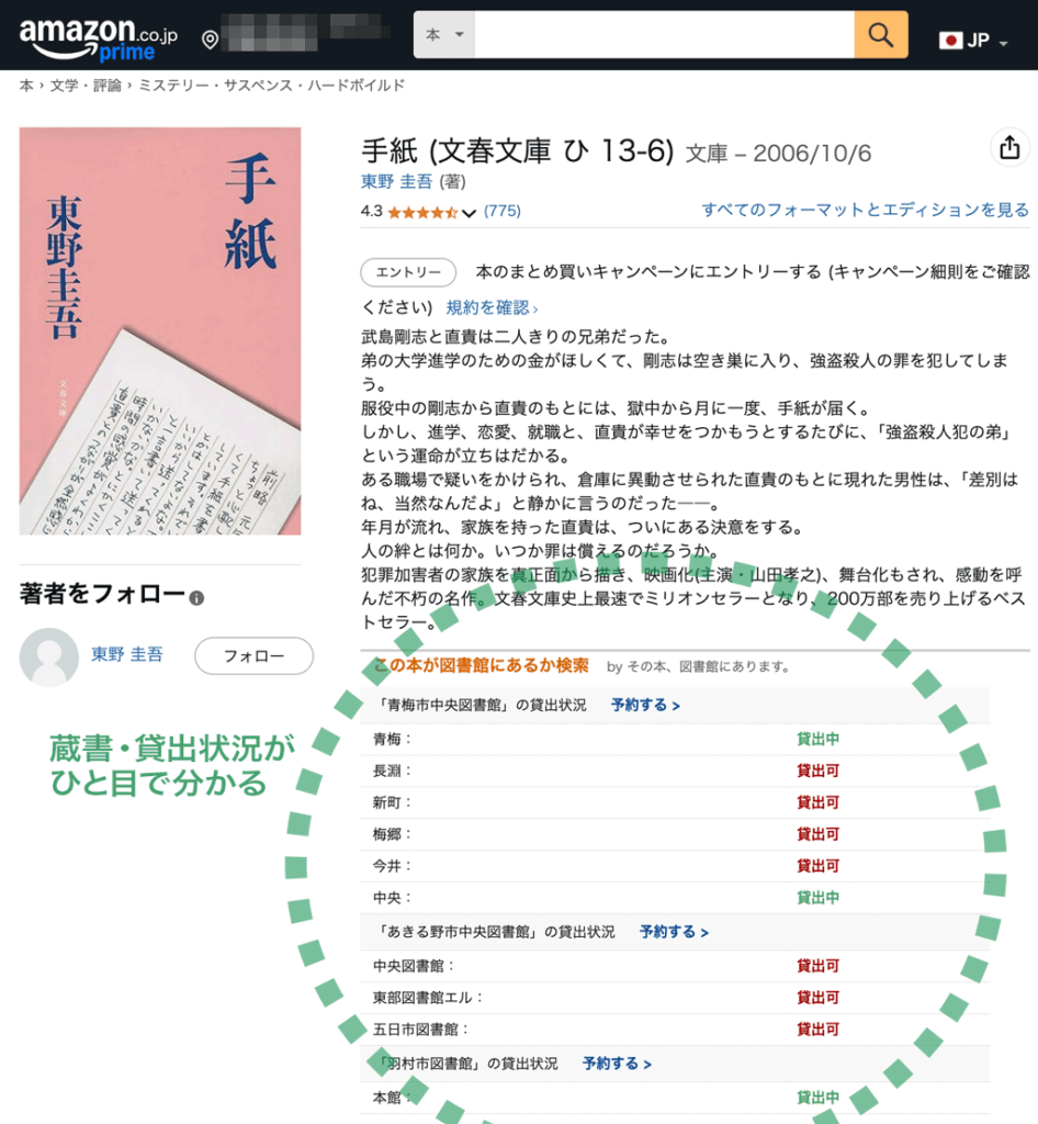 予め3つの自治体の図書館を登録すると、Amazonのサイトで蔵書の有無、貸出状況が分かります。「予約する」をクリックすれば図書館のサイトに移動します。