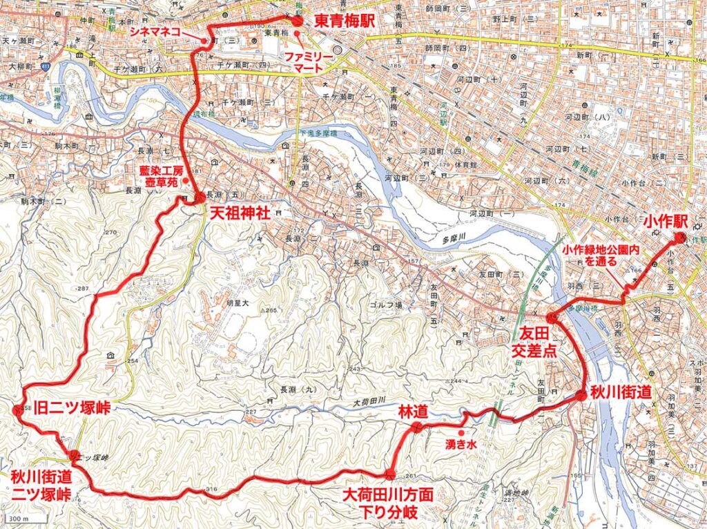 JR青梅線・東青梅駅 …〈30分〉… 天祖神社 …〈1時間〉…旧二ツ塚峠 …〈20分〉… 秋川街道 二ツ塚峠…〈1時間〉… 大荷田川方面 下り分岐 …〈15分〉…林道 …〈20分〉…秋川街道…〈10分〉…友部交差点 …〈25分〉… 小作駅