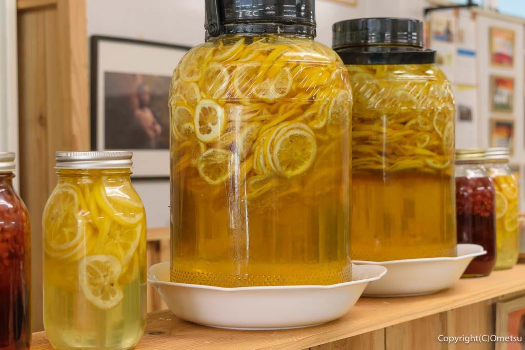 店内カウンターには、レモン漬けの瓶。国産・無農薬栽培のレモンを3ヶ月漬け、レモネードに使用します。皮ごと使うレモンは、ポストハーベストは避けたいところ、嬉しいオーガニック志向ですね。