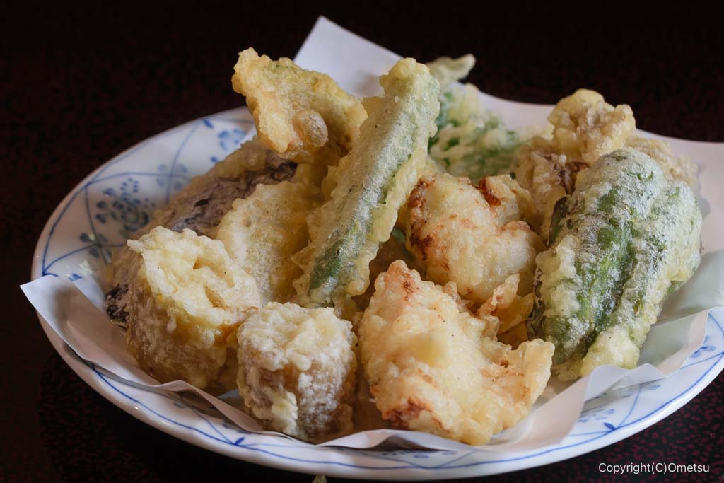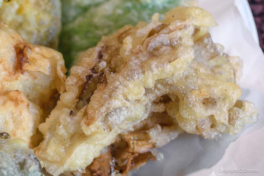焼き芋の天ぷらのほか、鳥天、オクラ、レンコン、ピーマン、カボチャ、ナス、マイタケ、 オオバなど、まさに盛りだくさんです!