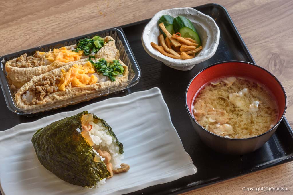 とり大根のおむすびと、三光いなりを注文。豚汁とお新香は、なんと無料サービスです!