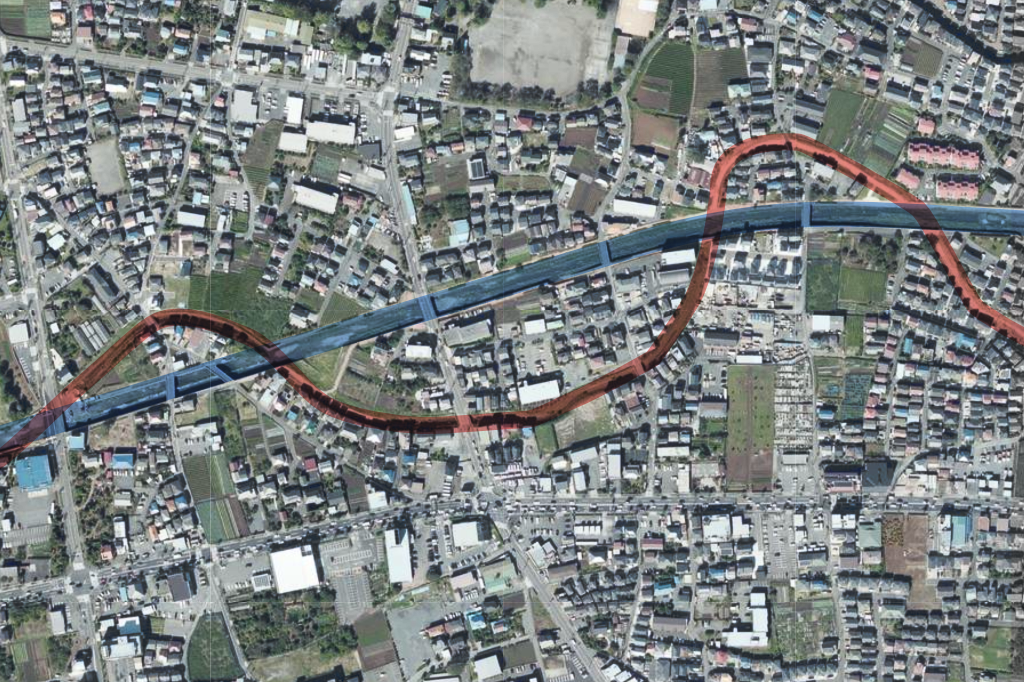 青いラインが新河川、赤ラインが旧河川。曲がりくねった河川を、ショートカットする工事が進められています。